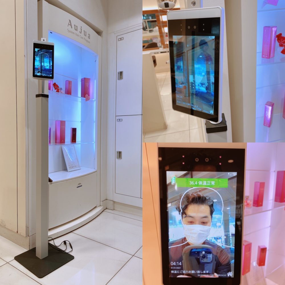 現在店舗では感染症対策を徹底して行っております。スタッフの検温はもちろん、全てのお客様に安心安全環境を提供するために非接触体検温使用しています。